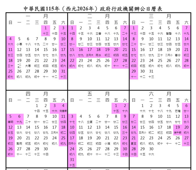 📍平假日定義(日曆表) : 白色日期為平日、粉色日期均為假日。