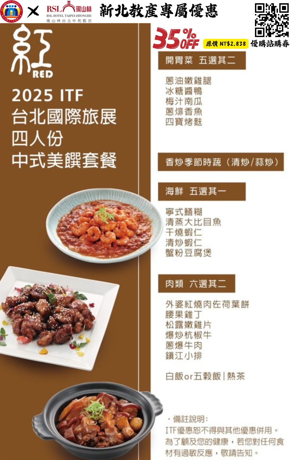*本券請於三天前訂位,訂位專線(02)2221-5658 紅餐廳分機2720或2721,如需外帶請於三天前預訂並另加購NT$180包材費用。