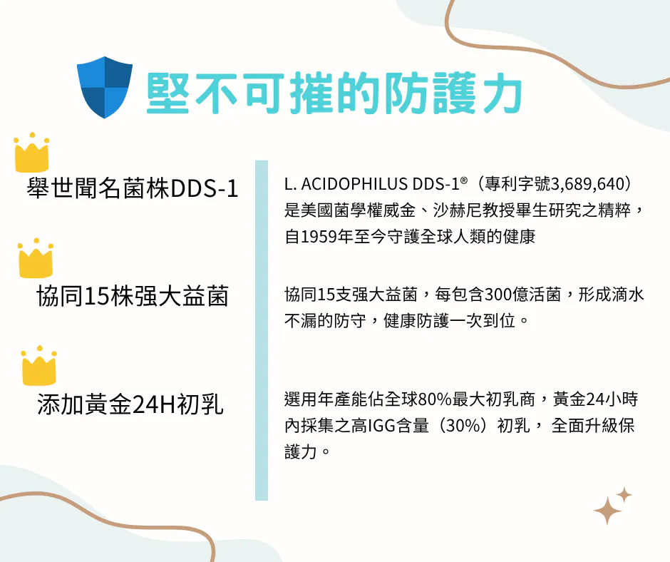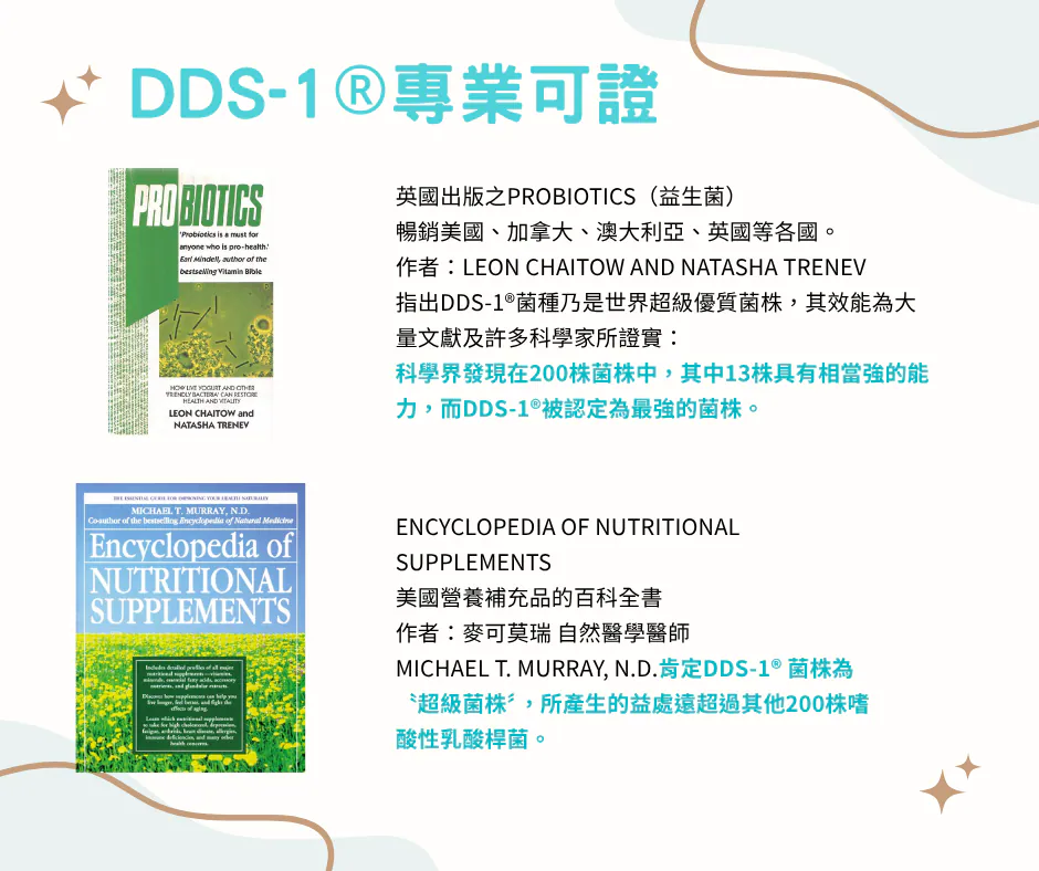 1、每包含總菌數300億,以舉世聞名菌株DDS-1爲主。